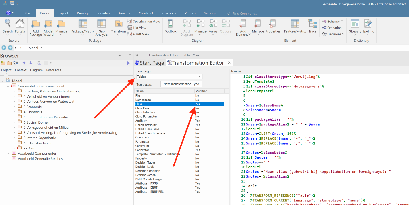Nadat je de templates in Enterprise Architect hebt geladen kun je ze binnen je eigen omgeving aanpassen om het gedrag aan te passen naar je eigen wensen. Het is belangrijk te zien dat de generatie naar DDL in twee stappen verloopt, en dat je dus op twee niveau aanpassingen kunt maken.