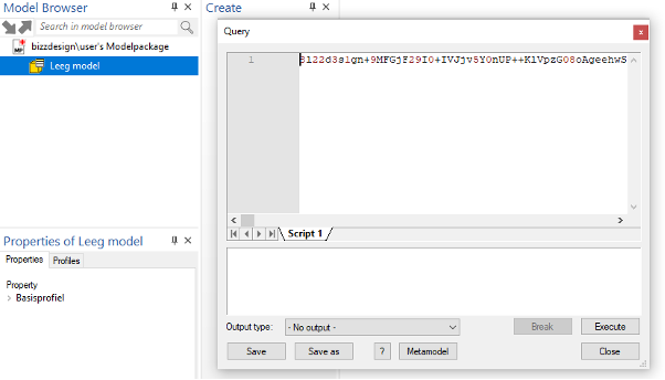 4. Selecteer het UML-model, en open de query-editor met ctrl-Q. Kopieer de inhoud van het scriptbestand UML XMI import Bizzdesign.txt in de query-editor. Sla eventueel het script op in het model.