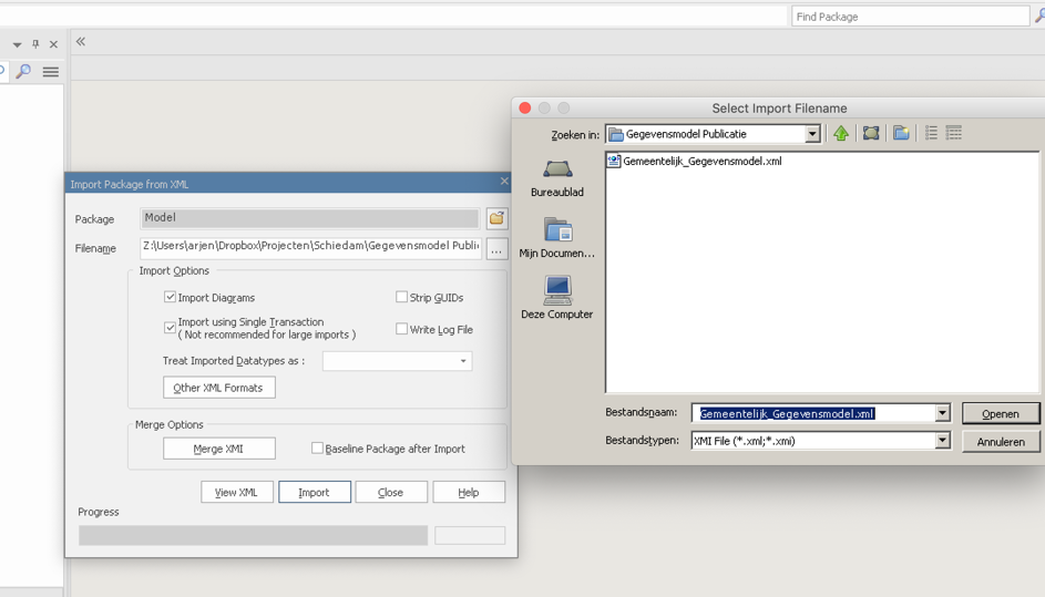 5. Selecteer bij ”Filename” het gedownloade bestand “Gemeentelijk Gegevensmodel XMI2.1.xml”